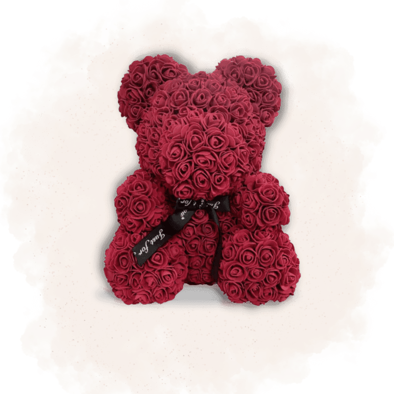 Offrez à quelqu'un de spécial un magnifique nounours rose rouge vin fait à la main de roses qui durent pour toujours. Le cadeau parfait qui aura sa place dans une pièce de décoration dans la maison ou le bureau. Conçu avec des roses éternelles synthétiques dans une couleur rouge vin romantique, cet ours en fleur fait à la main dure toute une vie sans aucun soin !